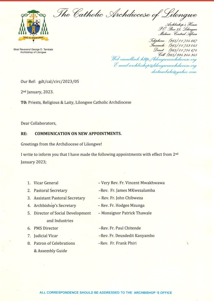 Reverend Father Mwakhwawa replaces Monsignor Patrick Thawale who was appointed to the post by late Archbishop Tarcisius Gervazio Ziyaye who died on December 14, 2022.