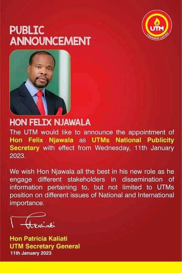 Former Member of Parliament for Blantyre Kabula Felix Njawala has been appointed as Publicity Secretary for the United Transformation Movement (UTM),a party headed by State Vice President Dr. Saulos Chilima.