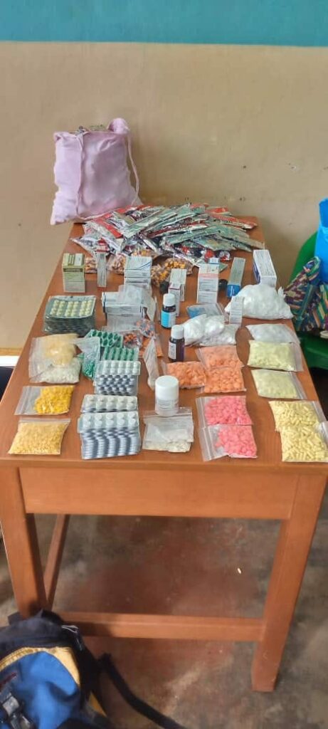 The police recovered a variety of medical drugs including Diclofenac, brufen, Amoxicillin, Abendazol, Promethazine, pregnancy kits, Amitriptyline, Ciprofloxacin, paracetamol, and Getacin.