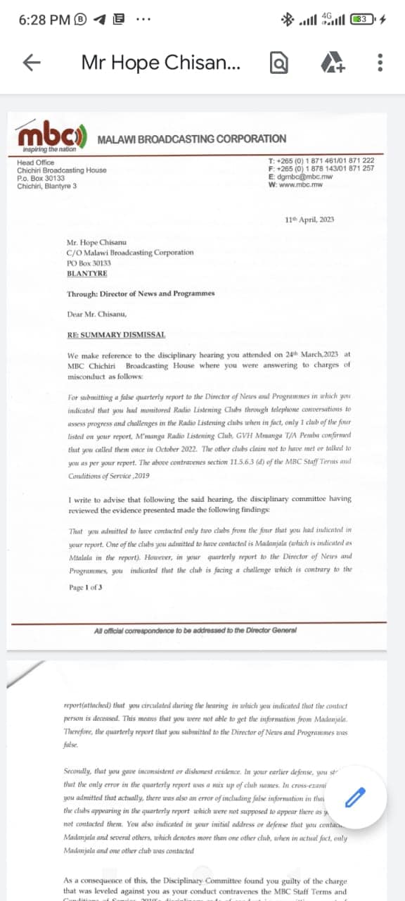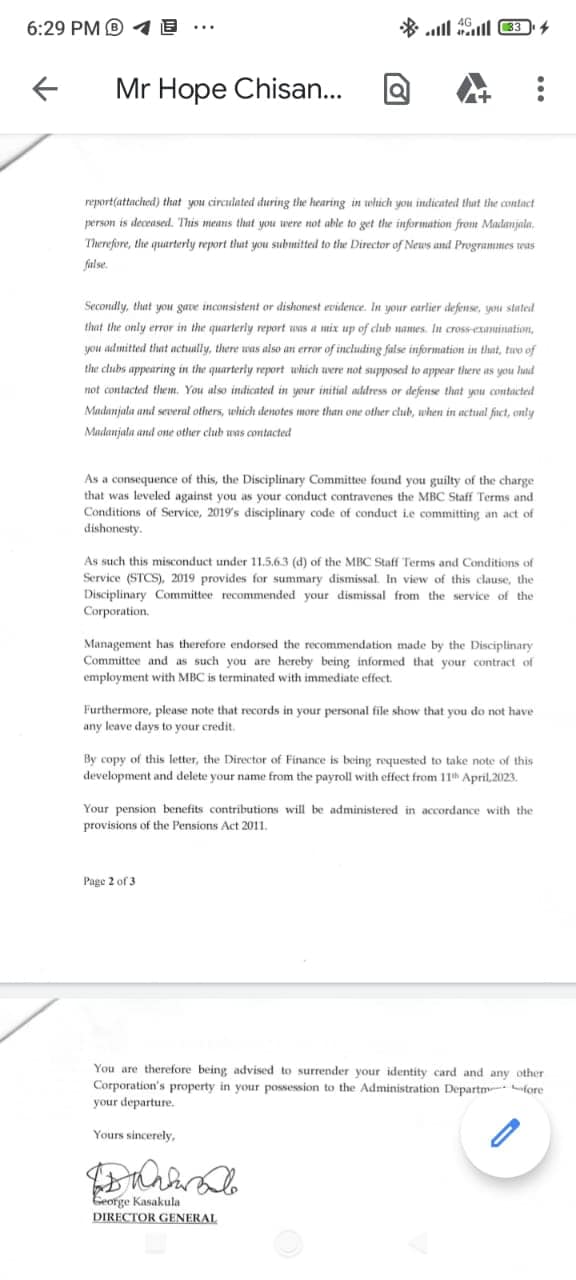 “Management has therefore endorsed the recommendation made by the Disciplinary committee and as such, you are hereby being informed that your contract of employment with MBC is terminated with immediate effect,” in part reads the letter to Chisanu dated 11th April 2013.