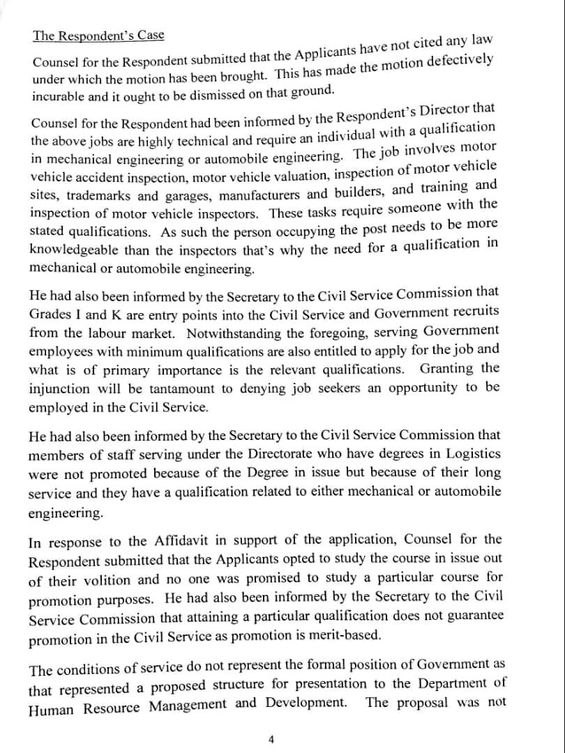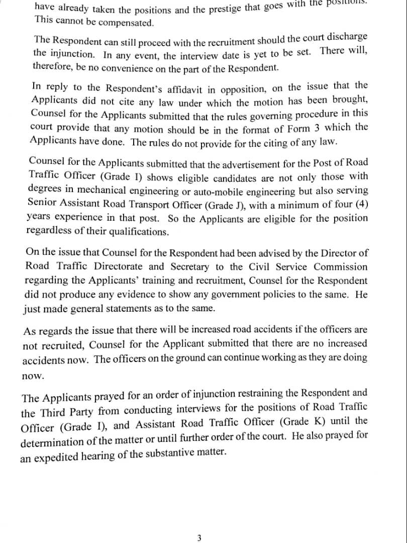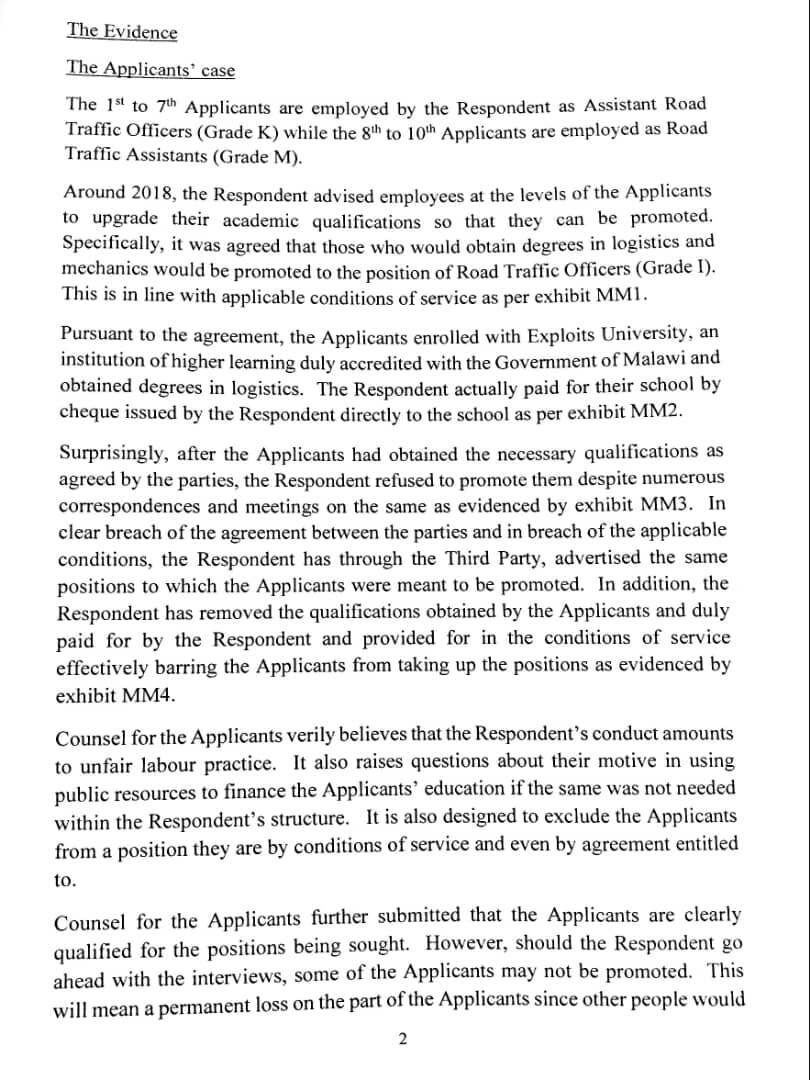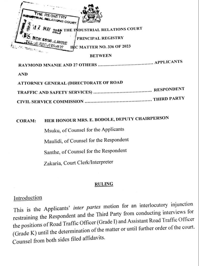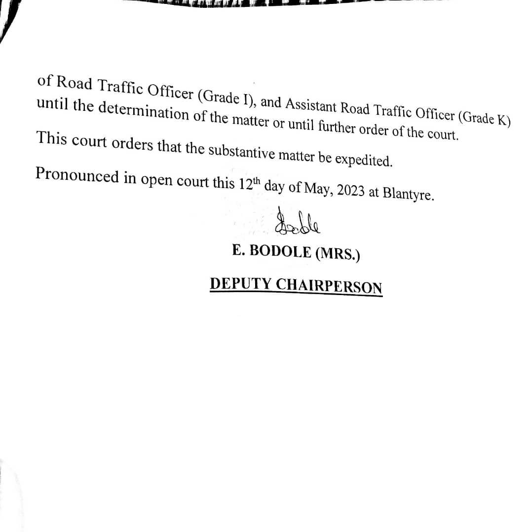 The Industrial Court in Blantyre has blocked the Directorate of Road Traffic and Services from proceeding with the recruitment of road traffic officers and assistant road traffic officers.