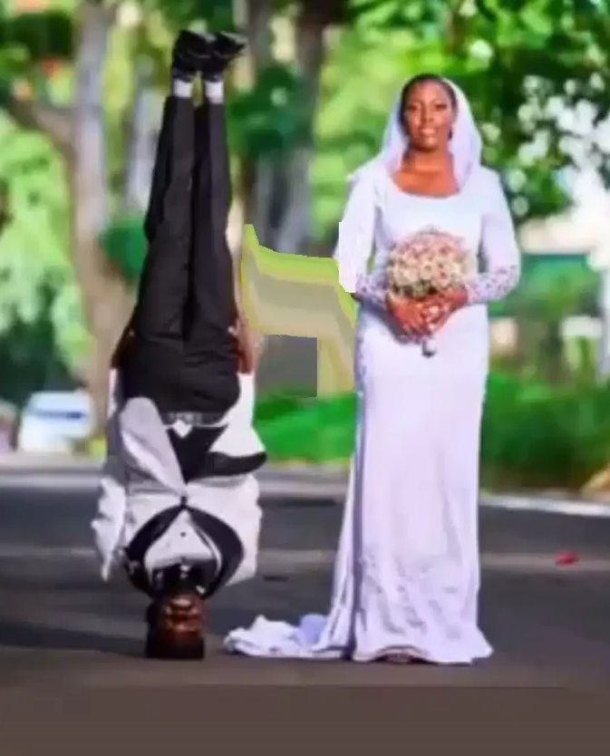 The bride could be seen posing for the photograph while the husband tried to stand on his head instead which he eventually achieved.