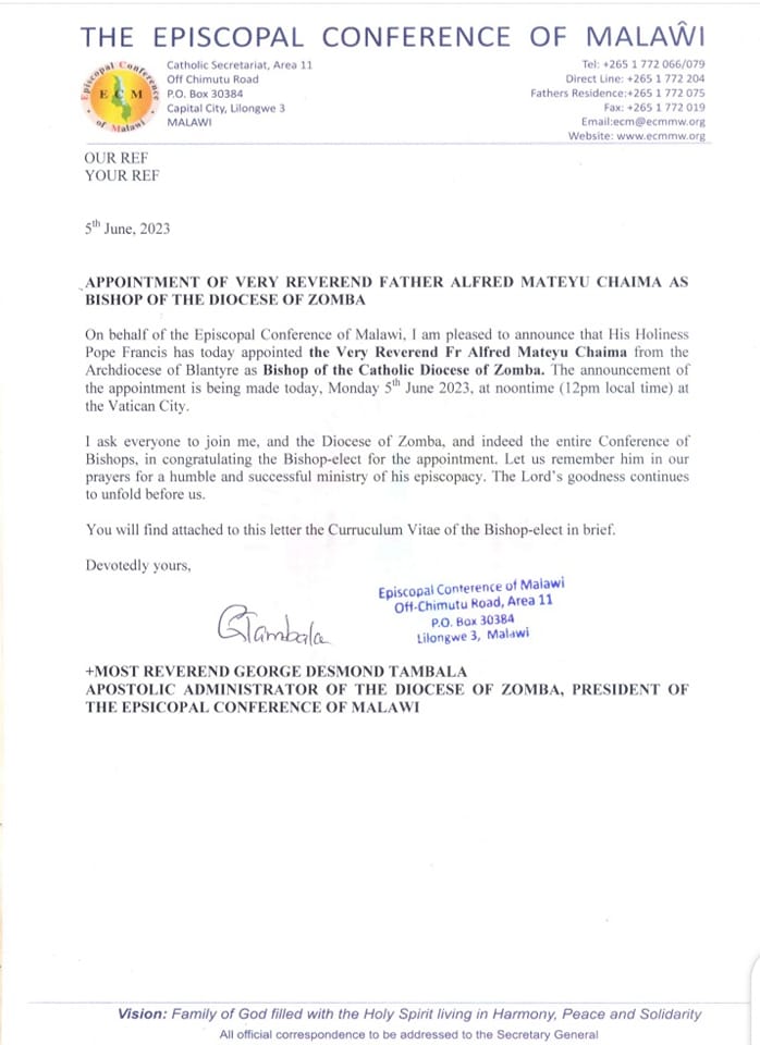 According to the statement signed by ECM President Archbishop Desmond Tambala, the appointment of Chaima is with effect from June 5, 2023.