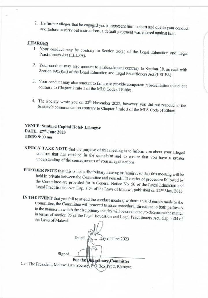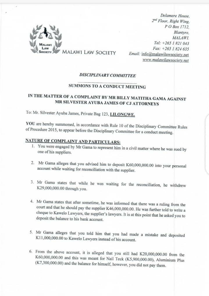 The Malawi Law Society has summoned lawyer Silvester Ayuba James to a disciplinary hearing.