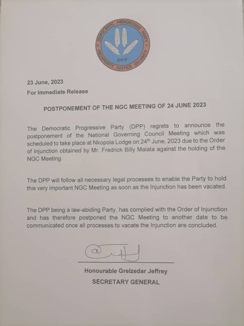 The opposition Democratic Progressive Party (DPP) has canceled its National Governing Council (NGC) meeting set for tomorrow (Saturday) at Nkopola Lodge in Mangochi.