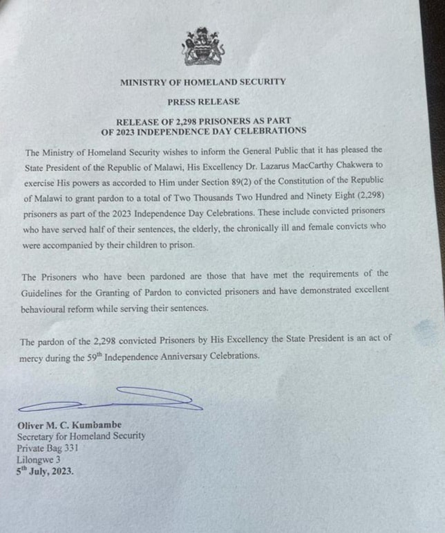 According to the statement, the pardon of the said prisoners is an act of mercy by President Chakwera during the 59th Independence Day Celebrations.