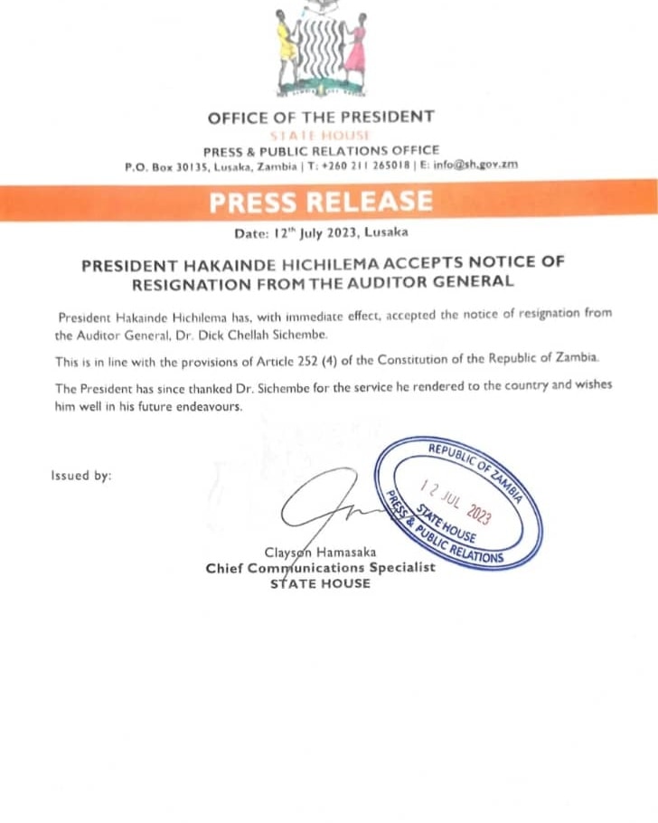 “President Hakainde Hichilema has, with immediate effect, accepted the notice of resignation from Auditor General Dr. Dick Chellah Sichembe.