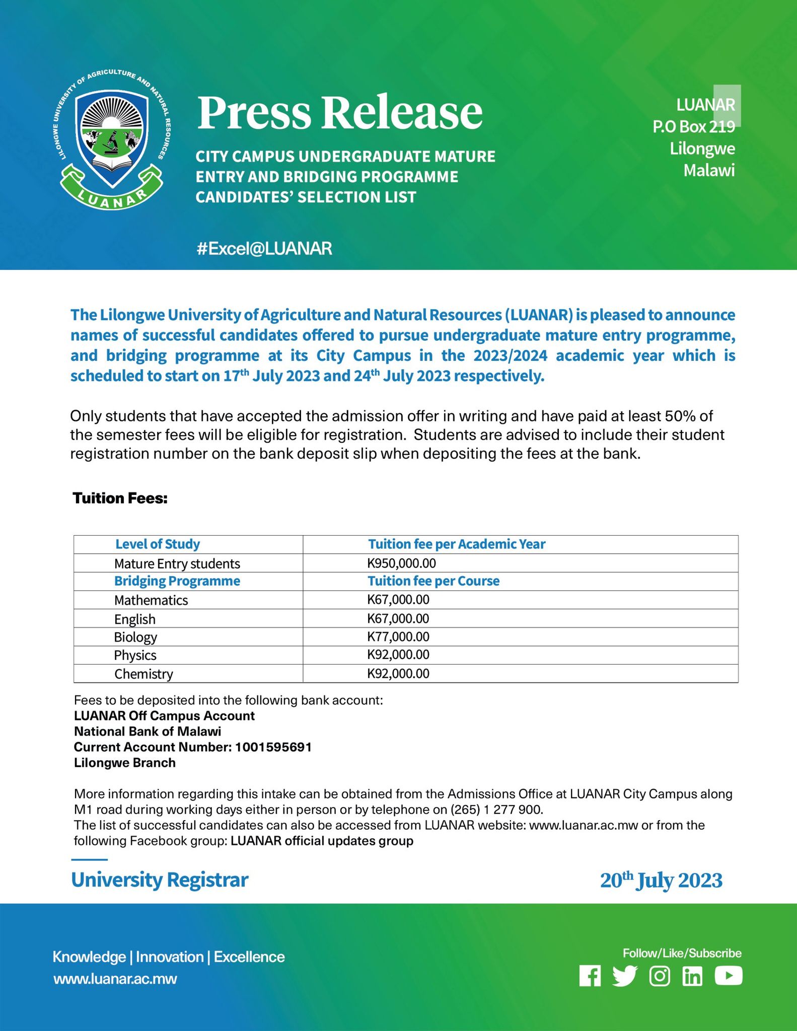 The statement further says Open and Distant Learning (ODL) students will now be paying K500,000 from K350,000, whilst City Campus and mature entry students fees has been adjusted to K950,000 from K890,000 per academic year.