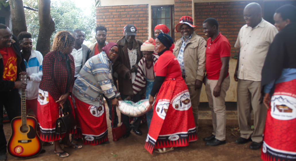 Members of the Chiwanja Cha aYao Cultural grouping on Wednesday cheered veteran musician Giddes Chalamanda at his home village in Chiradzulu where they donated assorted food items.