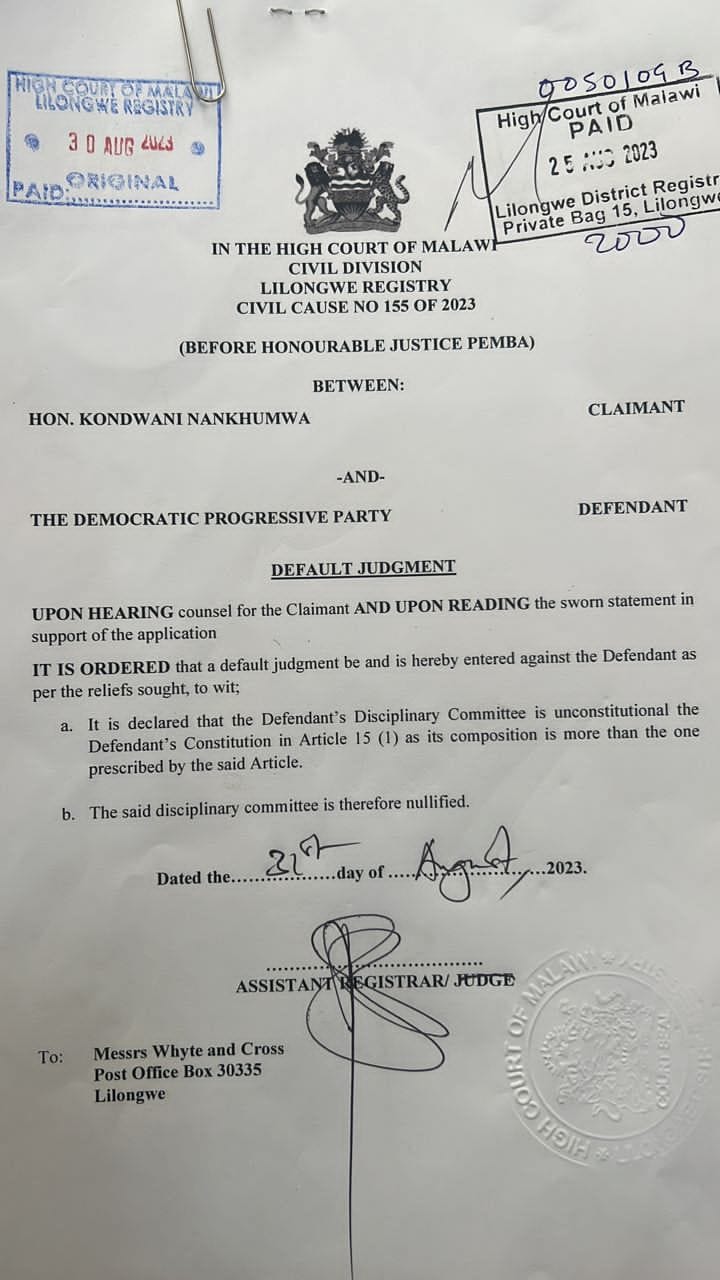 High court judge Justice Howard Pemba has nullified the Democratic Progressive Party (DPP)’s disciplinary committee for being composed of seven members instead of five as prescribed by its constitution.