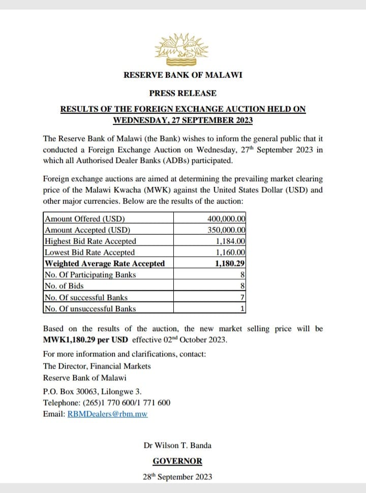 In a statement, RBM Governor Wilson Banda said the forex auction was successful as all Authorised Dealer Banks (ADBs) participated.