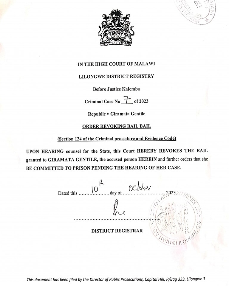 The High Court in Lilongwe has revoked bail for Giramata Gentile, the ex-wife of a Lilongwe-based Rwandese businessperson Habimana Noel Emily who was allegedly poisoned in October last year.