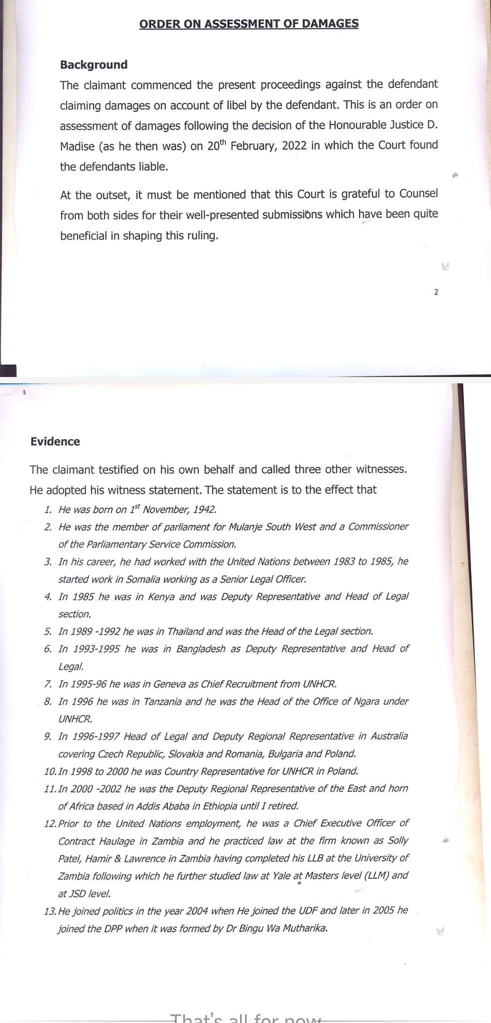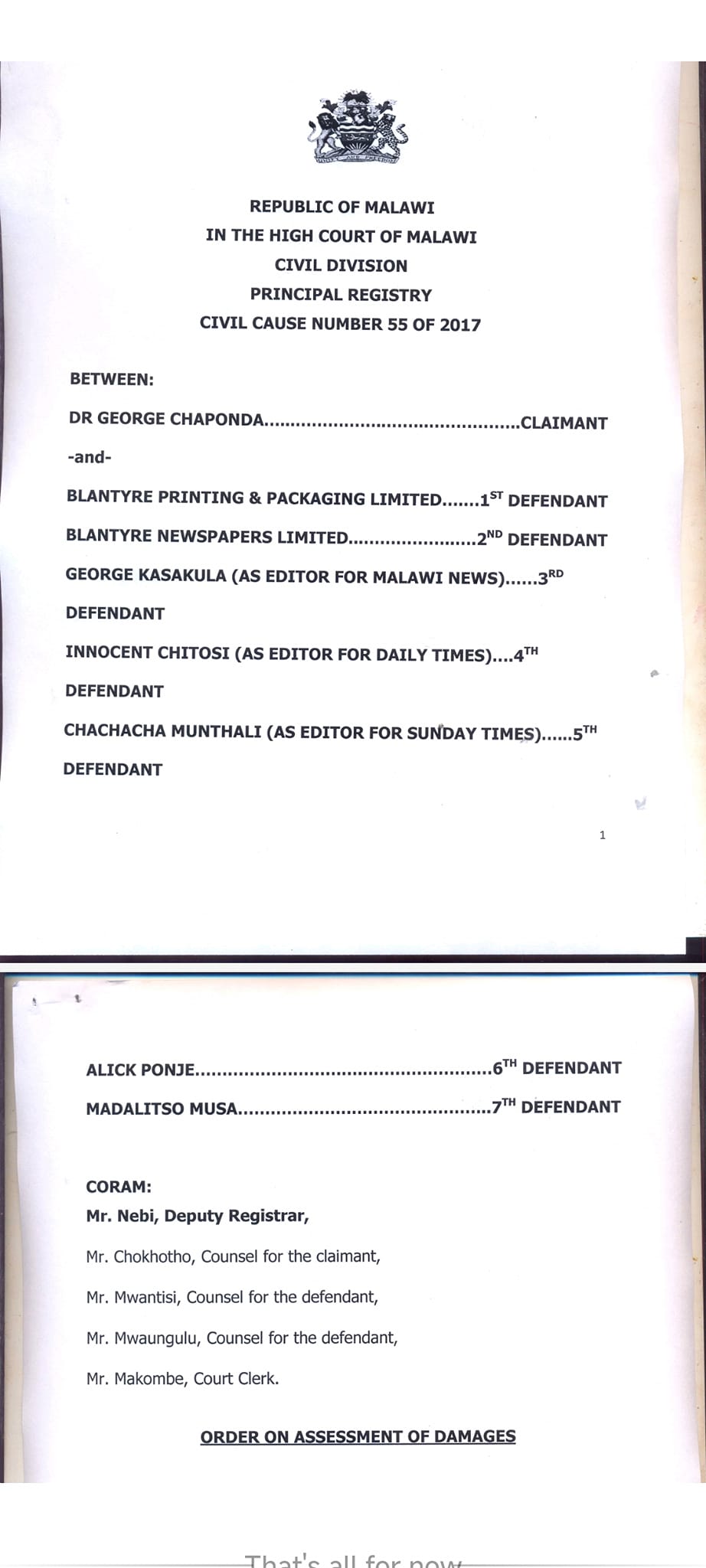 Chaponda sued Times Group former Editor In-Chief George Kasakula, The Daily Times Editor Innocent Chitosi, Sunday Times Editor Chachacha Munthali, Times Reporter Alick Ponje and The Daily Times Assistant Editor Madalitso Musa.