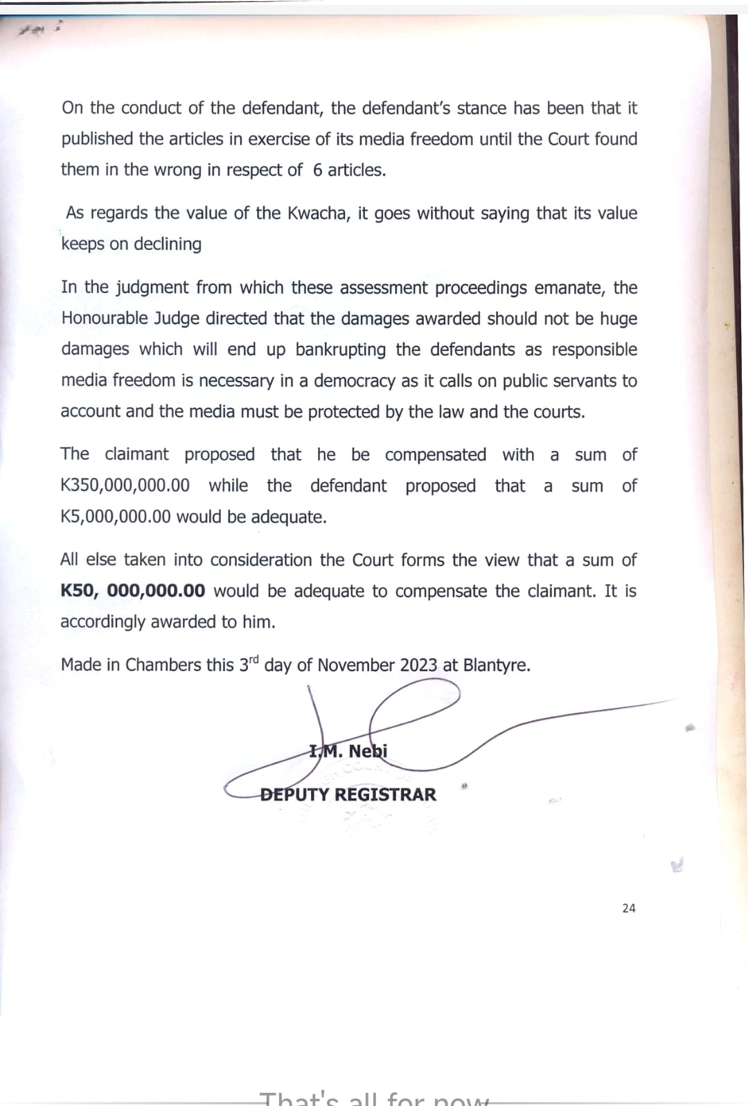 The High Court in Blantyre has ordered Blantyre Newspapers Limited to pay MK50 million to former Minister of Agriculture Dr. George Chaponda over stories its newspapers published in connection to the maizegate scandal.