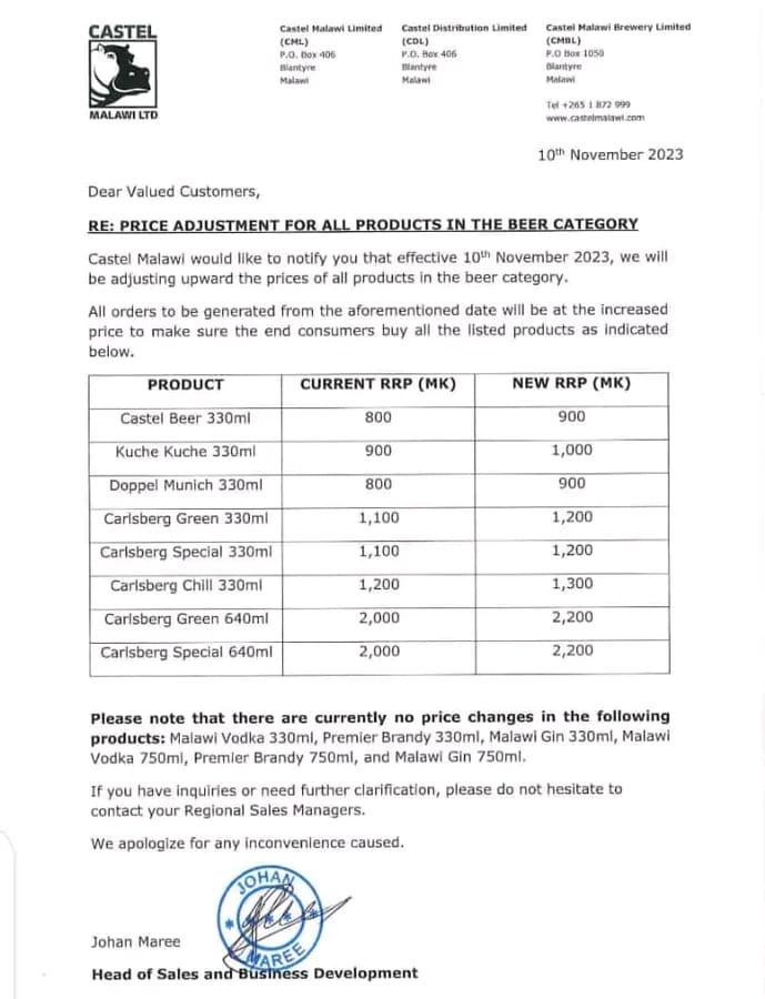 According to the new prices, Castel beer is now selling at MK900 from MK800 while Kuchekuche is now selling at MK1,000.00 from Mk900.00.