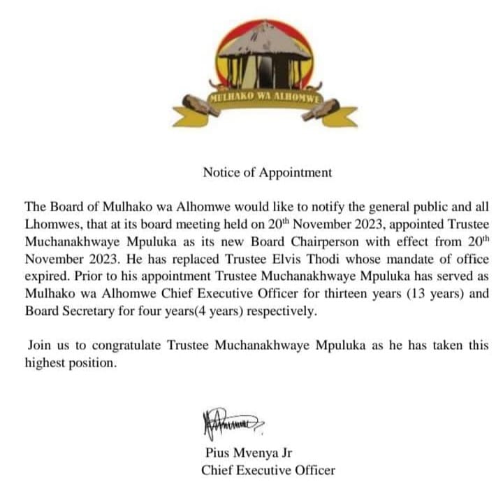 The board of a cultural grouping Mulhakho wa Alhomwe has appointed Muchanakwaye Mpuluka as its board chair with effect from November 20, 2023.