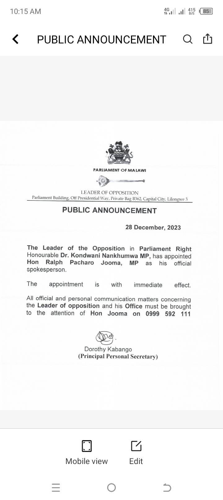 Leader of opposition Kondwani Nankhumwa has appointed Member of Parliament for Mangochi Monkey-Bay Ralph Jooma as his spokesperson.