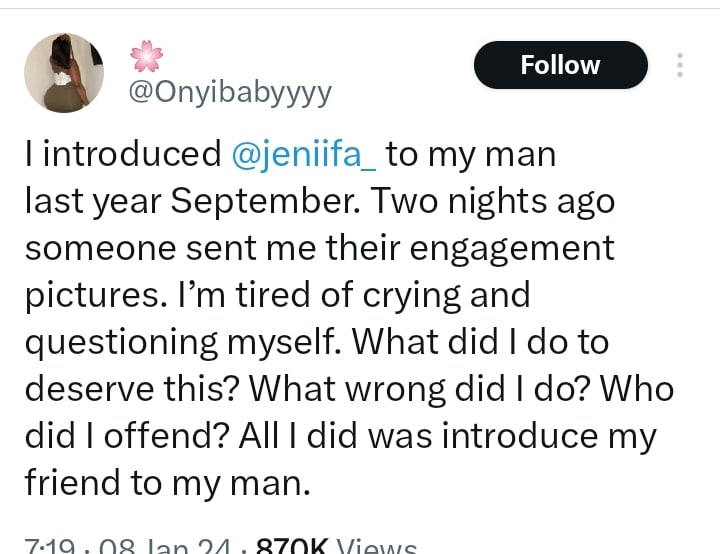 “I introduced @jeniifa_ to my man last year September. Two nights ago someone sent me their engagement pictures. I’m tired of crying and questioning myself. What did I do to deserve this? What wrong did I do? Who did I offend? All I did was introduce my friend to my man.