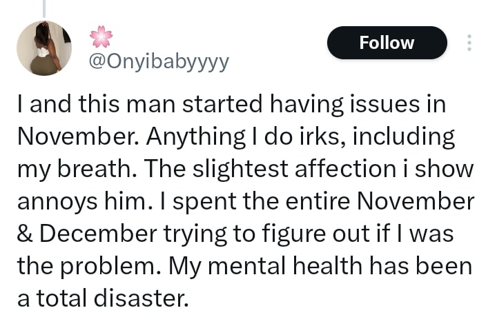 I and this man started having issues in November. Anything I do irks, including my breath. The slightest affection i show annoys him. I spent the entire November & December trying to figure out if I was the problem. My mental health has been a total disaster.