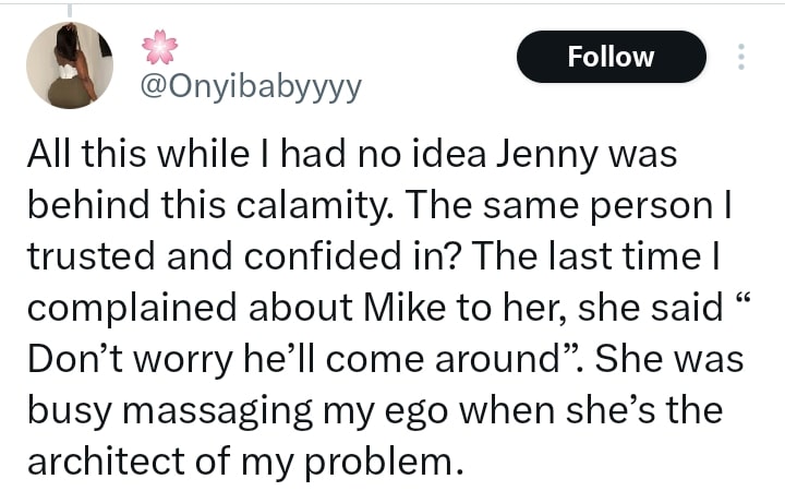 A lady named @Onyibabyyyy on Twitter accused her friend Jennifer of secretly getting engaged to her boyfriend after being introduced four months ago.