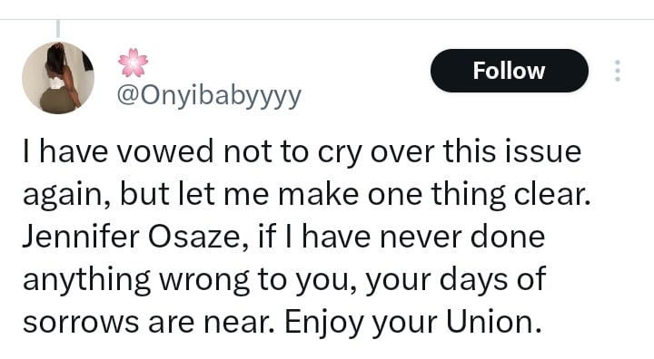 I have vowed not to cry over this issue again, but let me make one thing clear. Jennifer Osaze, if I have never done anything wrong to you, your days of sorrows are near. Enjoy your Union.”