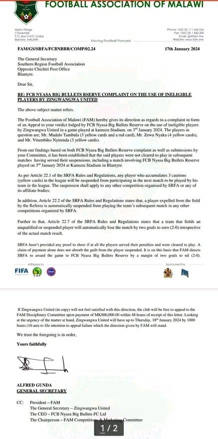 Football Association of Malawi (FAM) through its Disciplinary Committee has directed Southern Region Football Association (SRFA) to award FCB Nyasa Big Bullets Reserve a 2-0 win in the Second leg of their quarter finals match after Zingwangwa United have been found guilty of fielding suspended players.