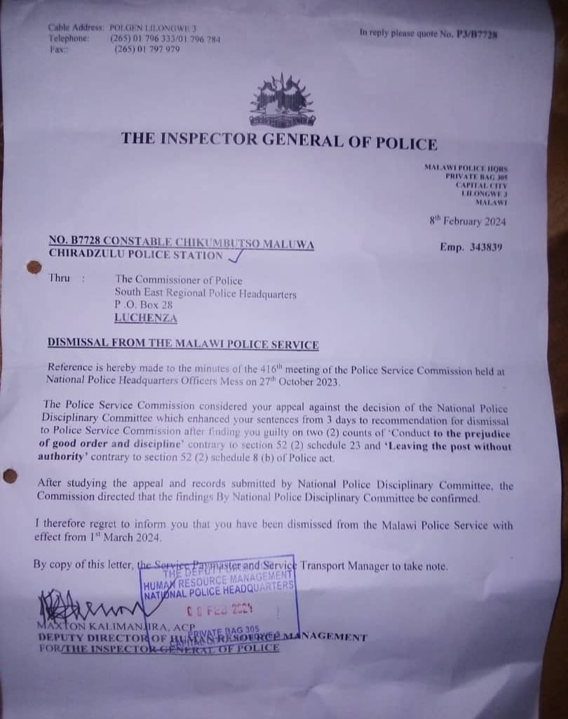 This has been confirmed in a letter signed by Maxton Kalimanjira, Deputy Director of Human Resources and Management for the Service.