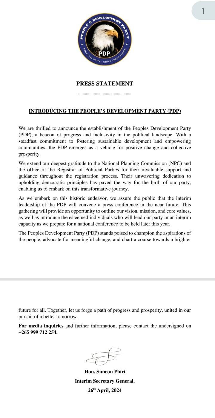 PDP interim Secretary General Simeon Phiri confirmed of the development in a statement announcing the formation of PDP seen by this publication.