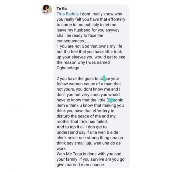 “Tina Baddie I don’t really know why you really felt you have that effontery to come to me publicly to let me leave my husband for you anyway shall be ready to face the consequences.
