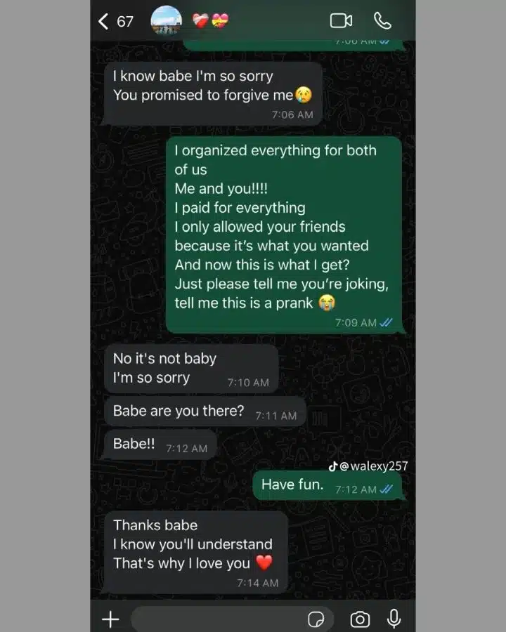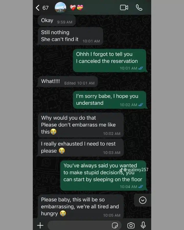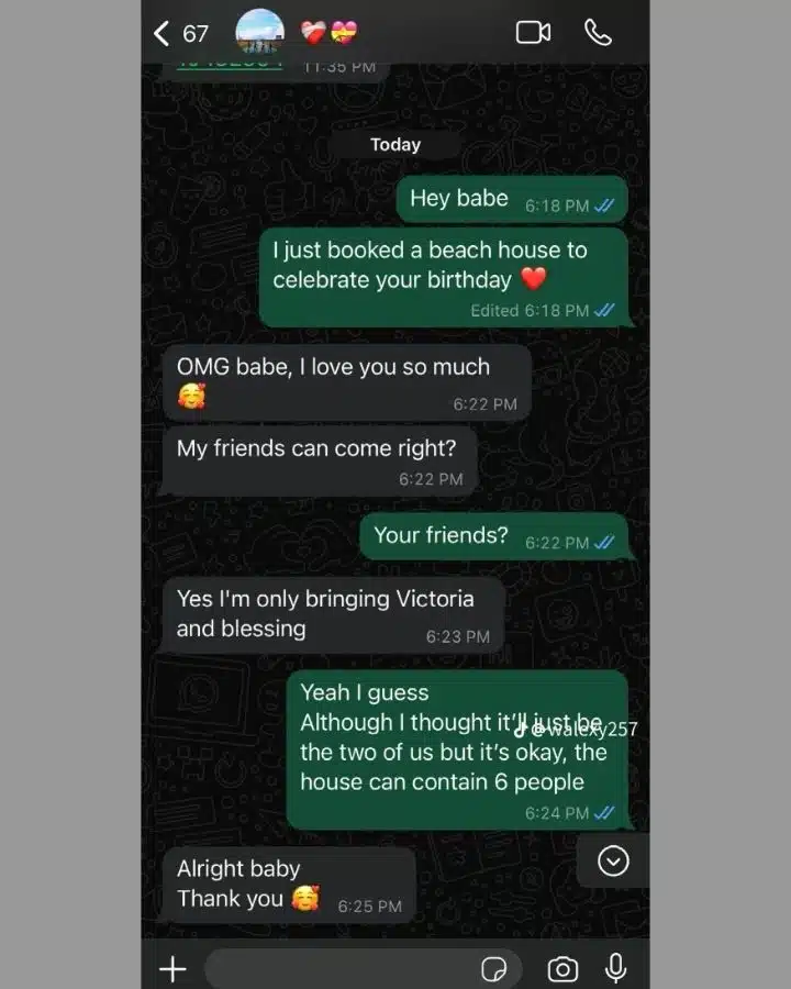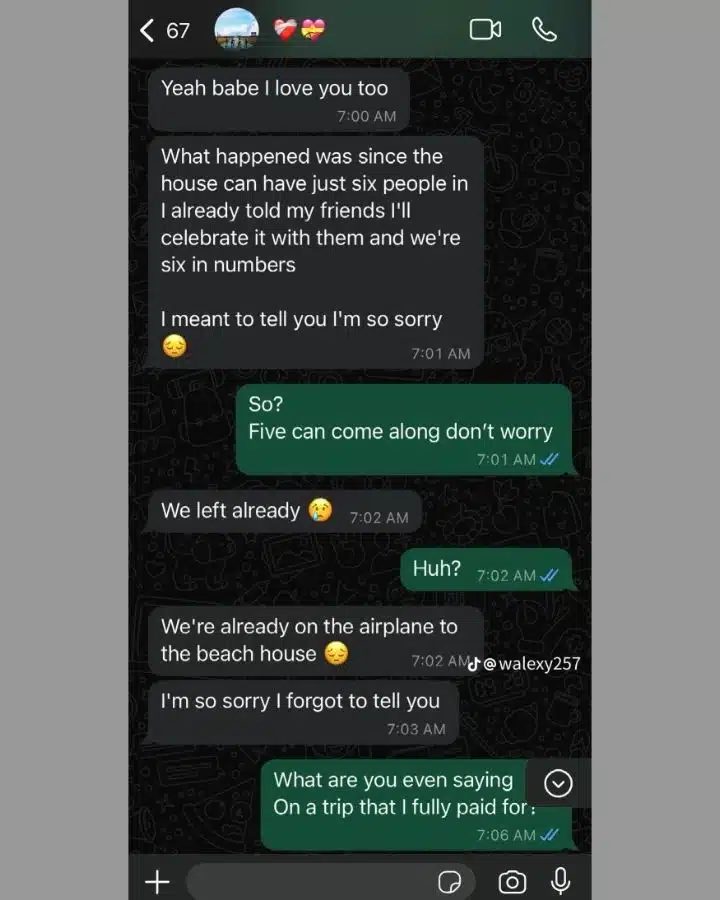 Screenshots of their chat, which went viral, revealed the man’s frustration. He had planned a special celebration for just the two of them and was upset by her additional request.