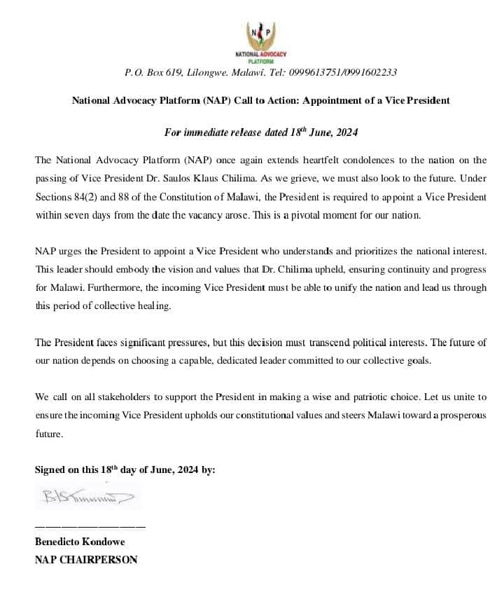 The National Advocacy Platform (NAP) has today released a press statement urging the president Lazarus Chakwera to uphold the constitution by appointing the country’s vice president following the demise of his vice the late Dr Saulos Chilima.