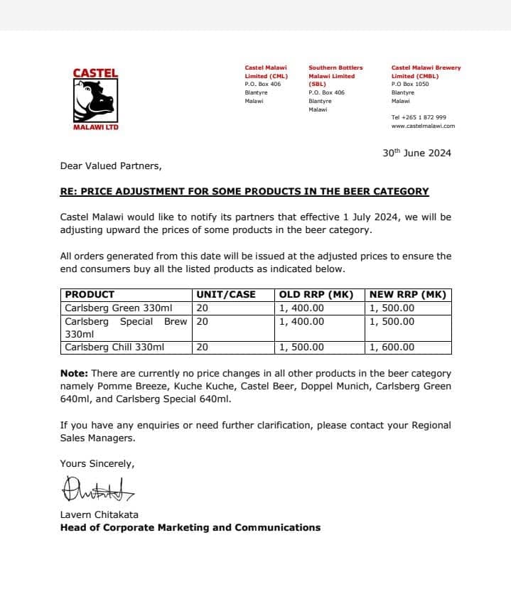 According to Chitakata, the price of Carlsberg Green and Special will now be selling at MK1,500 from MK1,400 respectively.