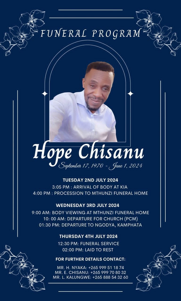 According to the program, upon arrival the body of Chisanu will be taken to Mthunzi funeral homes where it will be kept for a night.