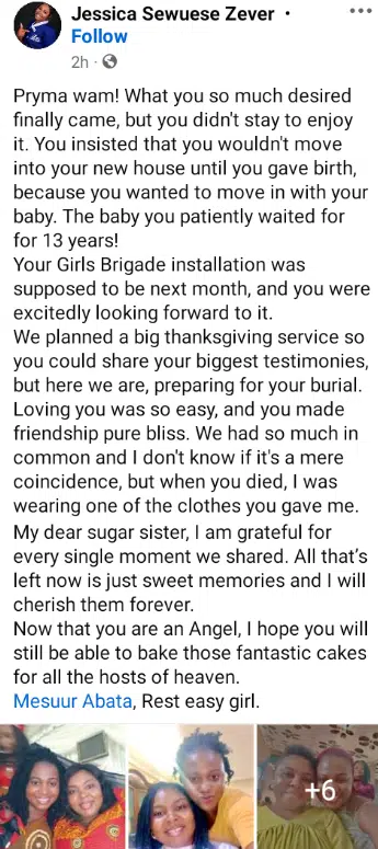 Unfortunately, her life was cut short just as she welcomed her long-awaited child into the world. In a heartfelt tribute posted on Thursday, July 4, 2024, Jessica expressed deep sorrow over Abata’s sudden demise.