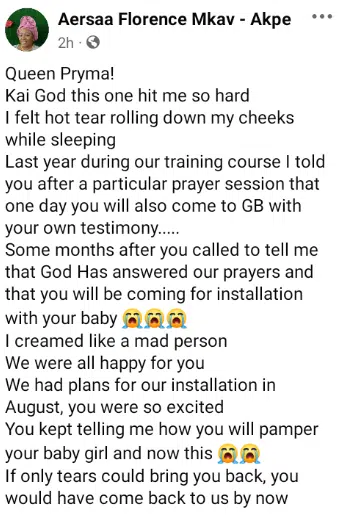 “Pryma wam! What you so much desired finally came, but you didn’t stay to enjoy it. You insisted that you wouldn’t move into your new house until you gave birth, because you wanted to move in with your baby. The baby you patiently waited for for 13 years,” she wrote.