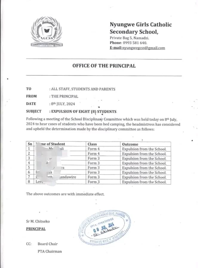 Eight form four students at Nyungwe Girls Catholic Secondary School have been expelled for allegedly being involved in in ‘bed camping’.