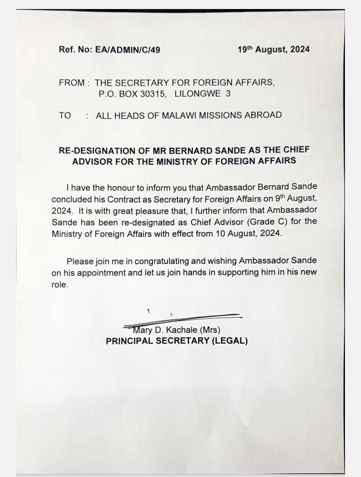 Information reaching this publication indicates that Ambassador Bernard Sande has been appointed Chief Advisor for the Ministry of Foreign Affairs.