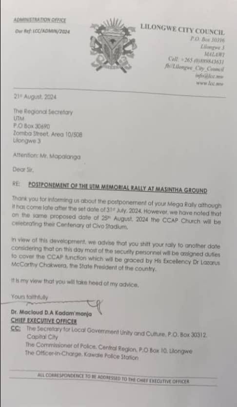 In a letter signed by LCC Chief Executive Officer Mac-cloud Kadam’manja addressed to UTM regional Secretary seen by this publication, the council says the rally collides with Nkhoma Synod of the CCAP which will be held at Civo Stadium in Lilongwe.