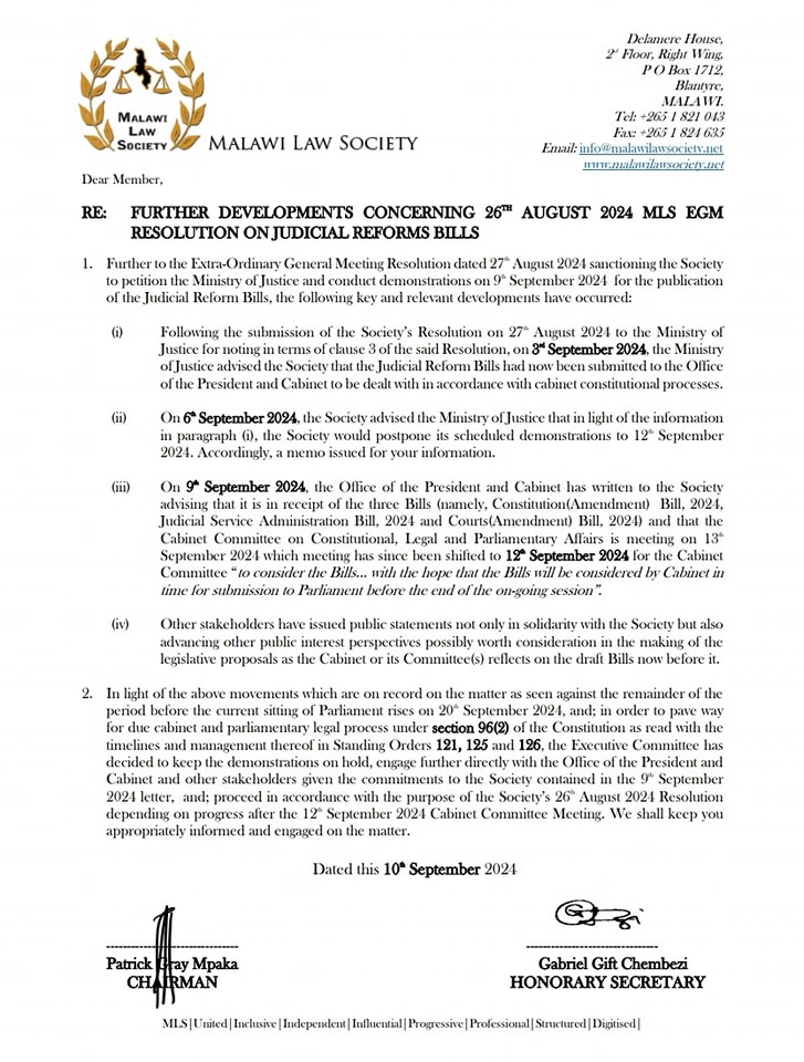 Malawi Law Society (MLS) has suspended its planned nationwide demonstrations scheduled for tomorrow to create room for further engagement with stakeholders, including the Office of the President and Cabinet (OPC).