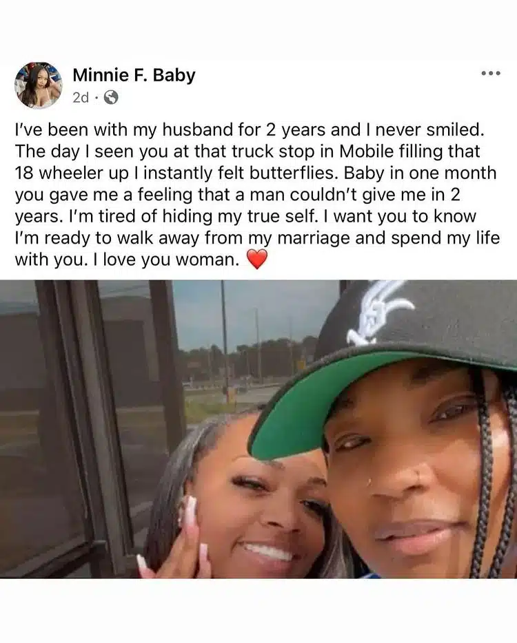 “I’ve been with my husband for 2 years and I never smiled. The day I seen you at that truck stop in Mobile filling that 18 wheeler up l instantly felt butterflies. Baby in one month you gave me a feeling that a man couldn’t give me in 2 years. I’m tired of hiding my true self. I want you to know I’m ready to walk away from my marriage and spend my life with you. I love you woman,” she added.