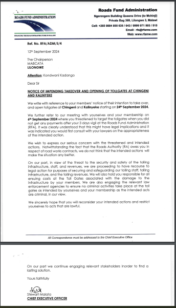 “In view of the threat to the security and safety of the tolling infrastructure, staff, revenues, we are proceeding to have recourse to legal action for purposes of security and safeguarding our toll staff, tolling infrastructure, and the tolling revenues, “reads in part the letter addressed to MABCATA Chairperson Kondwani Kadango dated September 12, 2024.