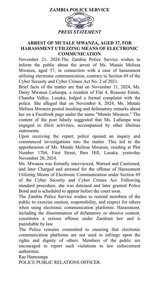 According to a press statement issued by Zambia Police Public Relations Officer Rae Hamoonga, Mutale was apprehended on November 20, 2024 at her home in Lusaka, in connection with a defamatory post made on her Facebook page on November 8.