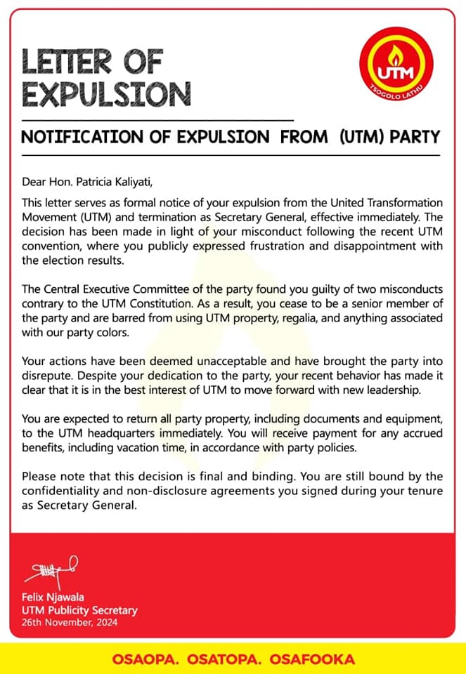 United Transformation Movement (UTM) spokesperson Felix Njawala has distanced himself from a letter notifying former Secretary General Patricia Kaliati of her firing from the party.