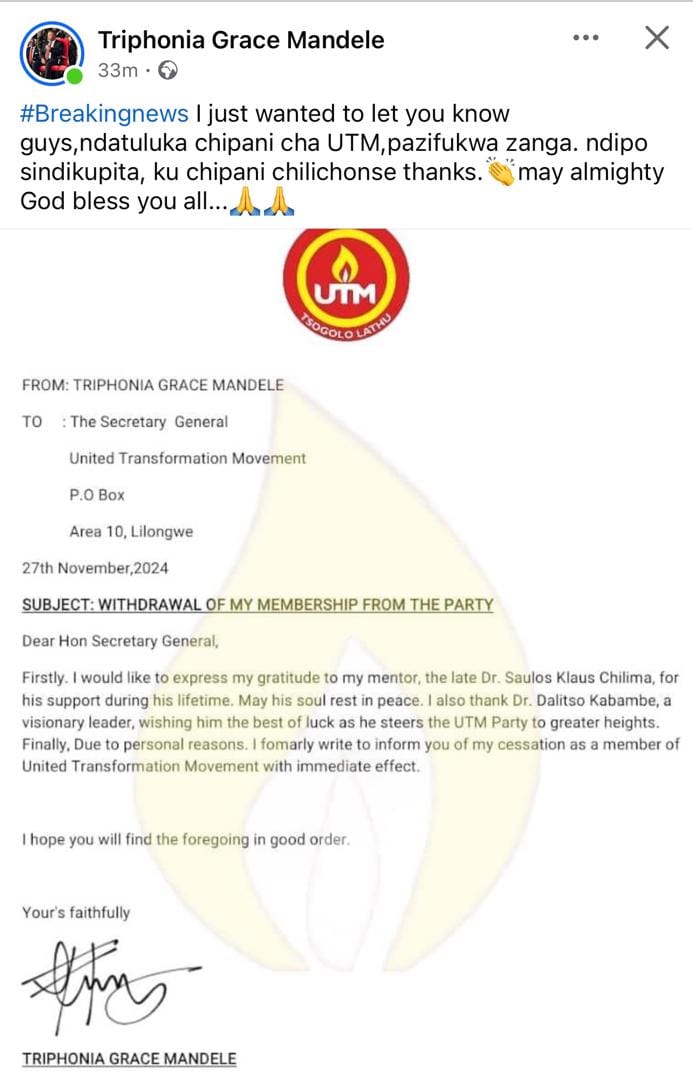“Due to personal reasons, I formally write to i inform you my cessation as a member of the United Transformation Movement (UTM) with immediate effect,” reads part of the letter.