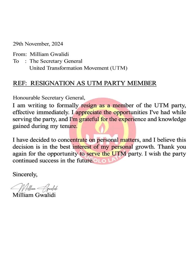 “I am writing to formally resign as a member of the UTM party, effective immediate. I appreciate the opportunities i have hard while serving the party and am grateful for the experience,” reads the letter in part.