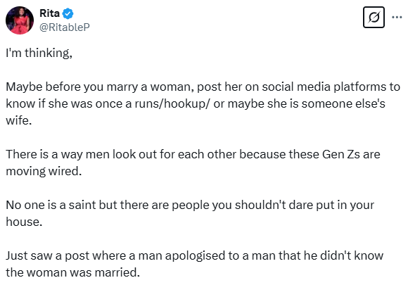 “I’m thinking, maybe before you marry a woman, post her on social media platforms to know if she was once a run/hookup/ or maybe she is someone else’s wife. There is a way men look out for each other because these Gen Zs are moving wired. No one is a saint, but there are people you shouldn’t dare put in your house. Just saw a post where a man apologised to a man that he didn’t know the woman was married,” she wrote.