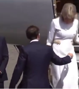 As they disembarked their plane in West London, President Macron offered his hand to help his wife. Brigitte, however, chose to use the handrail instead, seemingly ignoring the gesture.
