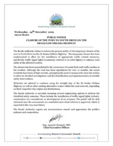 The Roads Authority (RA) has announced the temporary closure of the turn-off to Youth Drive on the Saulos Chilima Highway […]
