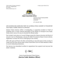 Malawi Police Services (MPs) has launched manhunt for a suspected incident of theft of materials from a motor vehicles belonging […]