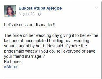Bukola Atupa Ajeigbe,a Facebook user posted a photo of a bride in her full attire ready to be banged from […]